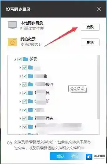 6、这时就会弹出设置同步目录的窗口,在这里点击“更改”按钮。这样以后设置的文件夹中有新文件的话,就会自动同步的微云保存。