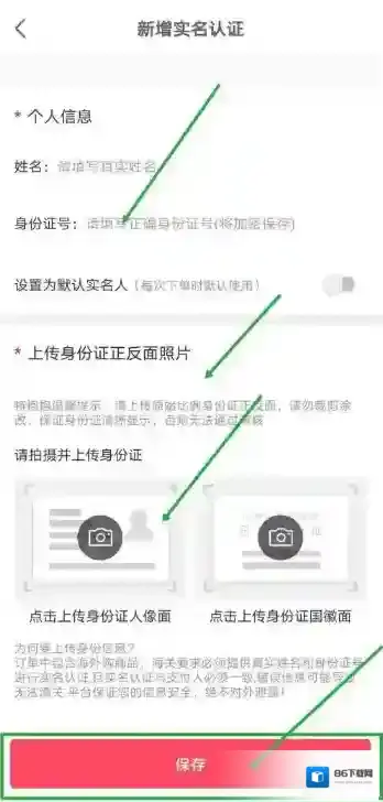 5、点击新增,输入真实姓名和身份证号码,上传身份证正反两面等信息后,点击“保存”
