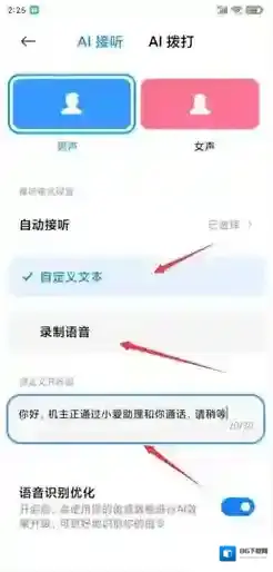 6、返回“AI接听”界面,选择触发自动接听之后的开场语,如果需要AI通话助手说开场语,则选择自定义文本然后输入自定义开场语。如果需要使用自己的声音说开场语,则选择录制声音,然后录制一段开场语。