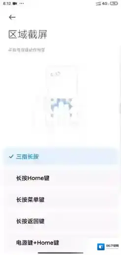 4、然后点击区域截屏,此时也可以看到区域截屏的触发方式为“三指长按”触发 ;