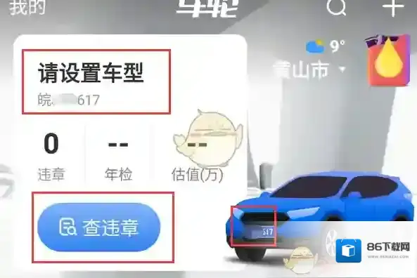 4、回到车轮查违章APP首页就可以看到已经绑定了该骑车了,点击“查违章”按钮。