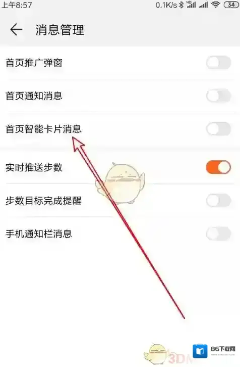 4、在打开的消息管理的页面中找到“首页智能卡片消息”设置项进入即可。