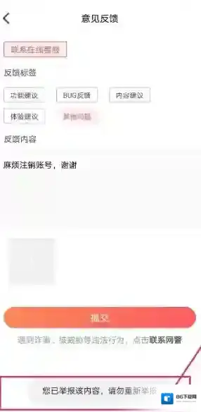 5、点击提交,如下图,看到您已举报该内容,请勿重新举报