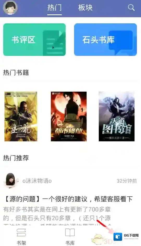 2、在书库页面中,你可以通过热门排行来找寻自己感兴趣的小说。