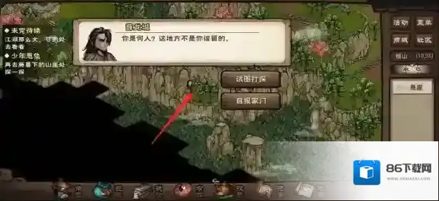 接下来用轻功跳到山崖(13,25)触发剧情,山洞里的薛龙城出现,这里选项都可以选,没有影响,然后狗娃找了过来,差点掉下山崖,一只黑鹰救了他。
