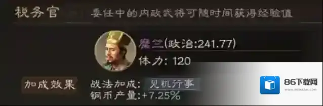 委任税务官可以大幅提升铜币产量,游戏中铜币的用处比较大,但是产出方式较少。糜竺是前期政治较高的武将,选择委任为税务官可以让铜币产量大幅提升。