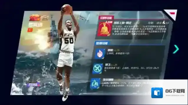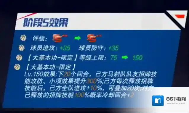 招牌技能大基本功:下X个回合,己方马刺队队友招牌技能攻防、小项效果提升X%;己方每次释放招牌技能后,己方全队进攻+X%,可叠加Y次;对方已释放的招牌技能X%概率冷却回合+Y(开启迈向巅峰时间:1月19日00:00)。
