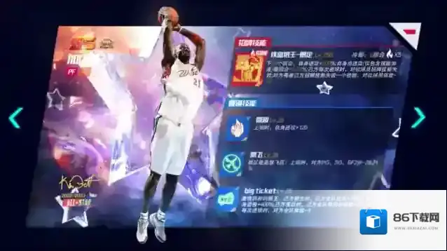 三技能big ticket:激情四射的狼王。己方领先时,己方全队进攻+X%,自身篮板+Y%;己方落后时,己方全队每回合体能+X;己方每次进球时,对方全队体能-X。