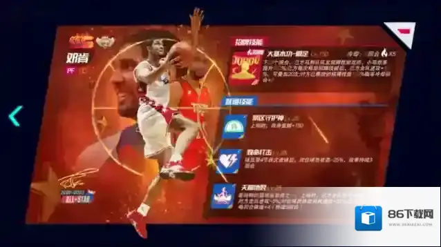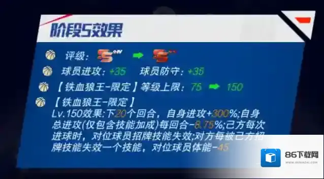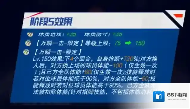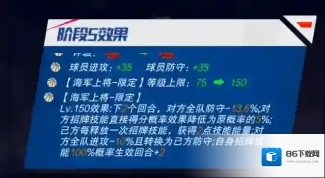 三技能天崩地裂:最纯粹的篮球运动员之一。上场时,己方全队防守+X%,对方全队进攻-Y%;对位球员体能消耗速度+X%;己方全队每回合体能+X(持续5回合)