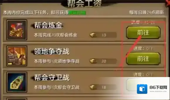 没有完成的帮会工资任务,可以点击活动后面的前往,选择去完成,帮会领地战和帮会守卫战,每周只,开放一次,不要错过哦。