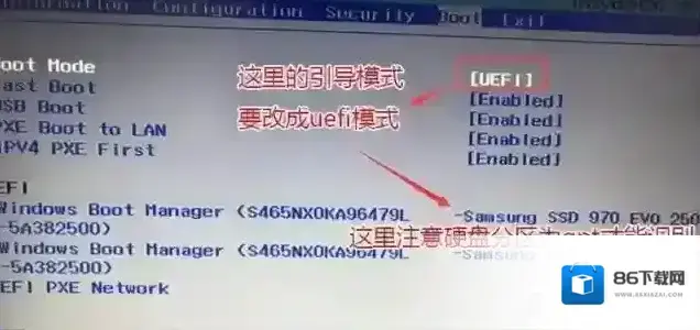 4、切换到Boot,把Boot Mode从引导模式改成uefi(这里引导必须为uefi,如果采用legacy模式安装,BIOS中无法认别新加的三星970硬盘,这样就无法正常从三星970 evo硬盘引导启动,如果你只是把三星970硬盘当成从盘就可以用legacy模式)如下图所示;