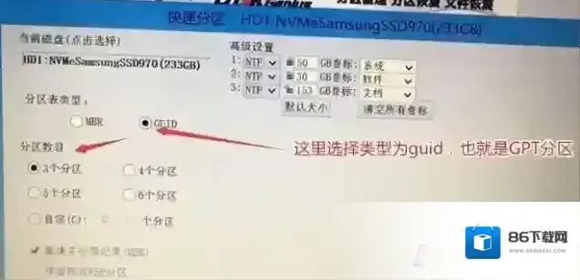 3、选择分区类型为guid,然后选择分区的个数,另外注意固态硬盘记得4K对齐,如图: