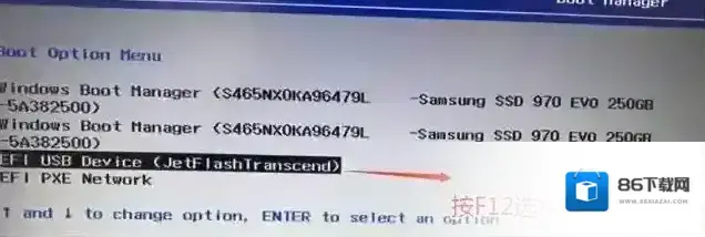 5、以上操作完成后我们按F10保存设置,然后插入制作好的U盘启动盘,重启按F12或FN+F12调出启动管理对话框,选择efi USB识别到U盘启动进入PE,回车;