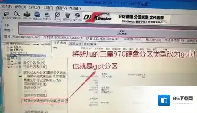 联想小新700预装win10改win7教程步骤三:磁盘分区与系统安装1、进入pe系统后,打开DiskGenius分区工具,点击硬盘,选择转换分区表类型为guid格式,如图:
