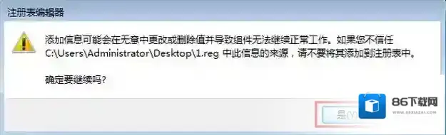 5、这时在桌面上生成名为“1”的注册表文件,双击该文件,提示“添加信息可能会在无意中更改或删除值并导致组件无法继续正常工作”的对话框,不要管它,直接点击“是”。
