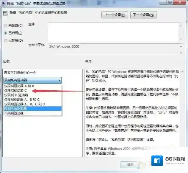 7、选择点击已启用。在选项框里选择“仅限制驱动器C”,最后点确定。