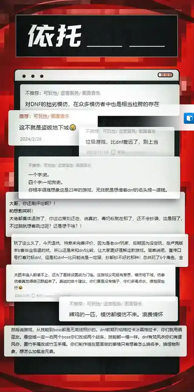 他们致敬了我们logo、名称,衍生出无数个“地下城”“勇士”“阿拉德”的排列组合,他们致敬了我们的职业,从职业名称、立绘、技能形态一条龙复刻,他们致敬了我们的玩法,从地下城、深渊到强化增幅、团本,应有尽有,他们致敬了我们的老朋友们,不仅致敬了赛丽亚、凯丽、GSD,也一次次高价请DNF的老朋友们频频上直播、做代言,致敬程度更高的,直接“搬运“了我们的游戏内素材,成为了我们宣发上“孪生兄弟”,还有希望在致敬的基础上,去做一些“升级”,把2D变成了“3d”,也缝合了各式各样的其他玩法,致敬者们在兢兢业业的在模仿、在致敬,然而真的给各位勇士带来的体验却是…