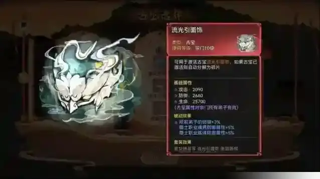 最后可以选择流光引面饰,虽然这个古宝侧重防御方面,比起另外两个古宝来说性价比不算高,但不要忽略了3个古宝凑齐所带来的套装效果也是十分强力的。