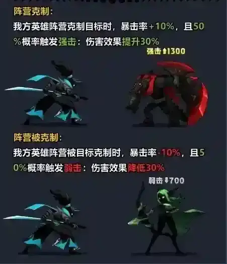 当我方英雄阵营克制目标时,将会提高暴击、触发强击以及提升伤害,反之,若被克制时,将会减少暴击、触发弱击以及降低伤害。