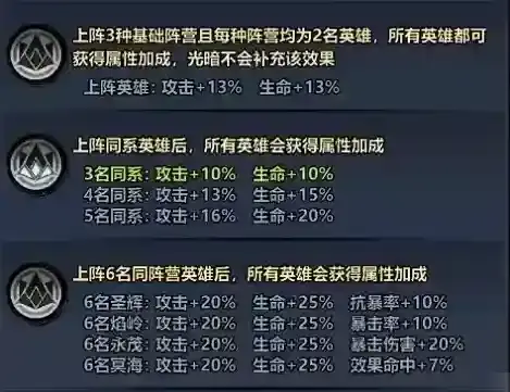 当上阵的英雄为同系英雄时,相同羁绊英雄之间将会获得额外属性加成效果。随着同系英雄的上阵人数增加,相关英雄所获得的羁绊属性加成也会随着提升。