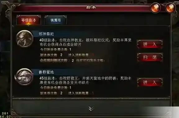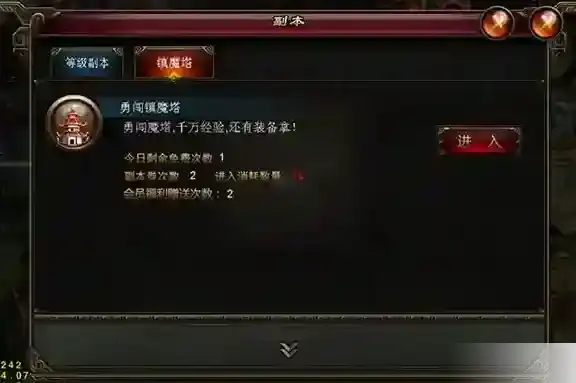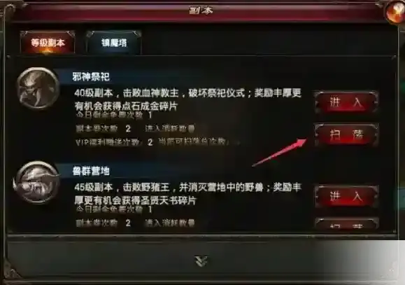 ⑤镇魔塔:前期后期主要获得经验方法之一。于副本一样,每日一次免费机会,购买副本卷轴课额外增加2次机会。开通青铜VIP可额外增加1次机会。开通黄金VIP额外赠送2次机会。