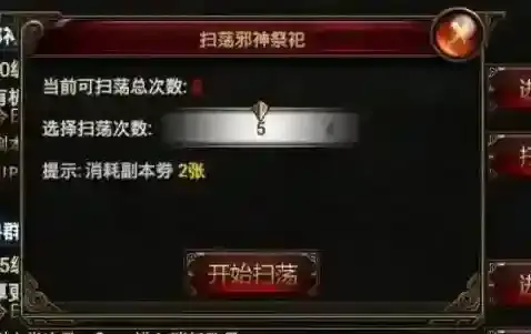 如图所示:副本界面有个扫荡按钮,选择需要完成的次数,点击之后,即可完成副本,领取经验和奖励,提示一瞎小伙伴们注意把背囊的物品清空一下,不然就无法完成扫荡。