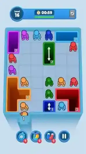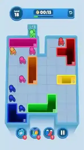 游戏的玩法比较简单,通过移动关卡里的方块让对应颜色的小人进入洞口就可以通关。在关卡里只有对应颜色的小人才可以进入洞口,而且不同颜色的方块和小人是无法穿过去的,移动各种颜色的方块来寻找合适的途径,将所有的小人全部送入洞口来体验最有趣的闯关过程。