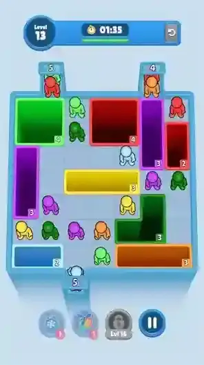 2、每关都会有不同颜色的小人需要进入对应的洞口,每个洞口可以进入的小人数量是有限的。