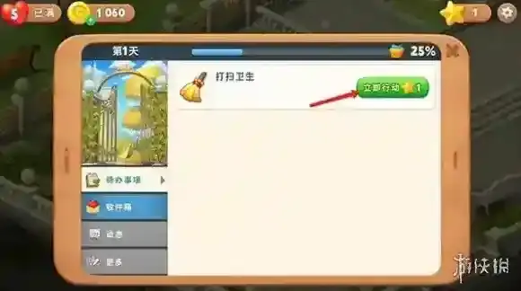 5、出现打扫卫生的任务了,选择立即行动选项。