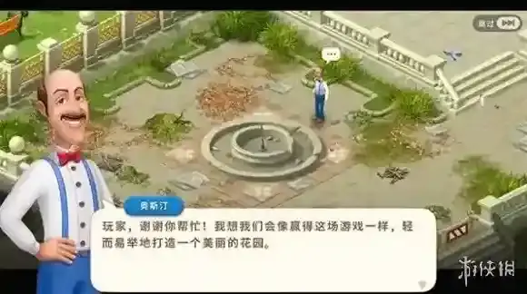 1、打开梦幻花园手游,进入游戏剧情界面,点击右上角可跳过。