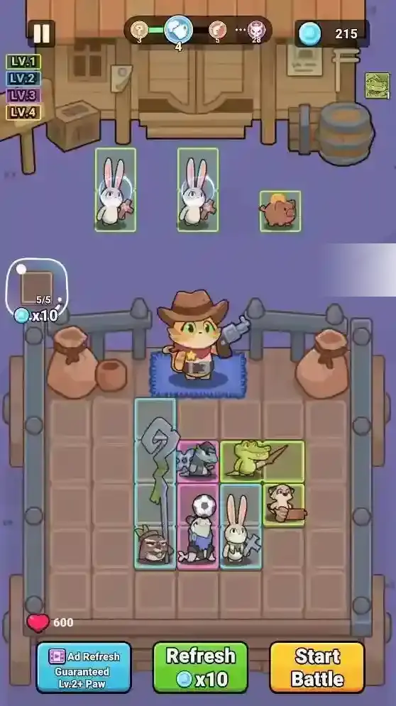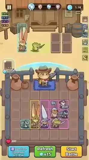 2、进入关卡后玩家可以将初始伙伴放入背包,相同的伙伴可以合并提升等级,点击refresh可以获得新的伙伴。