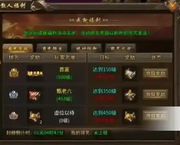 合区后成就福利活动关闭,活动排名奖励以邮件的形式发送!