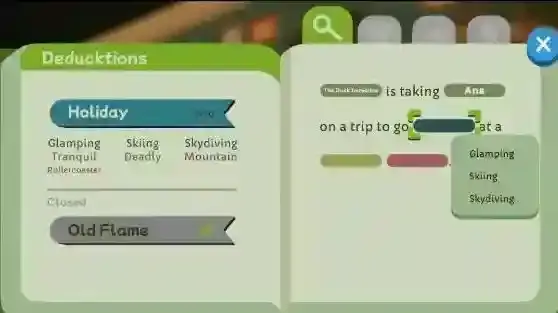 游戏中的调查玩法和其他侦探推理游戏不同,玩家需要自己收集关键线索然后填入到对话里来获取信息,这些信息的线索隐藏在周围的环境里,或者是和NPC的对话中,与其说是推理游戏,不如说是一款解谜游戏,通过收集各种线索来填补空白并解开谜团,不断收集更多证据来捉拿真正的犯人。