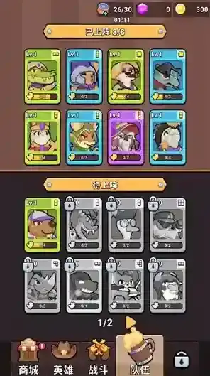 2、进入关卡后玩家可以选择初始英雄进行战斗,相同品质的英雄可以合并来提升等级。