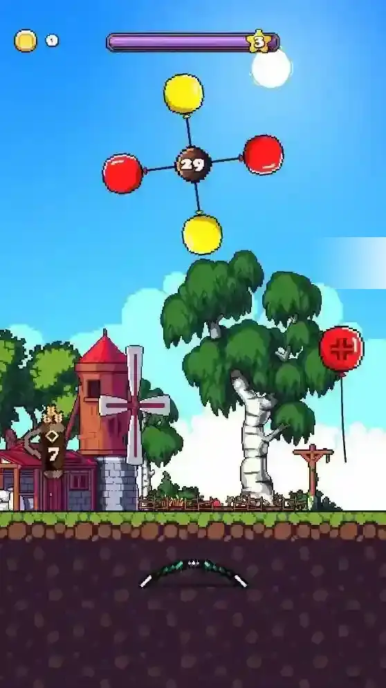 游戏里的玩法比较简单,就是发射弓箭射击气球,当关卡里的气球全部被击破就可以通关。需要注意的是每次需要击破的气球是有顺序的,玩家需要根据关卡给出的气球颜色来发射弓箭击破气球,如果击中错误的气球就会减少闯关时间,如果不能再规定时间内完成就会闯关失败。
