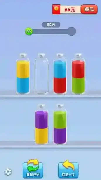 3、通过灵活的操作来将同种液体倒入同一瓶子中,全部装好后即可过关获得奖励。
