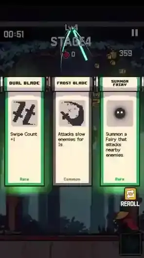 3、当切开水果后玩家会获得经验,经验满后可以升级获得技能,玩家可以选择一个来强化自己。