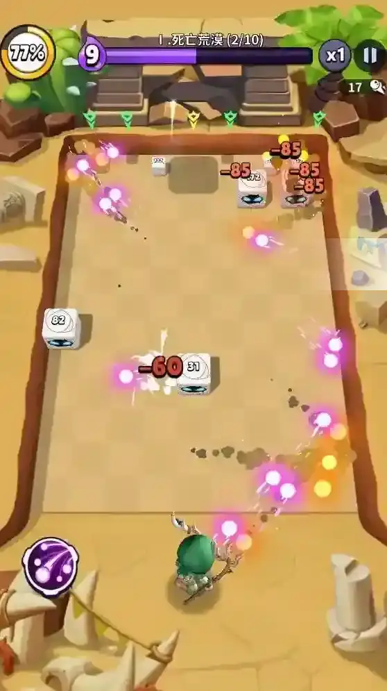 2、进入关卡后滑动屏幕来控制小球的发射角度,角色会自动发射小球进行攻击。