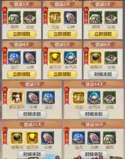 每日登录,根据登录天数领取各式奖励,VIP用户更能得到双倍福利。登陆30天后,即可收获50万宝石、1000令牌和5000万银两的丰盛奖励,助你在江湖中蓄力飞跃!