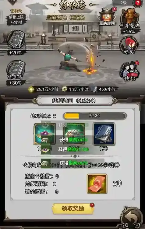 在练功房里,玩家可以悠闲离线挂机,获得丰厚的经验、银币、武学卡和BOSS扫荡券等奖励,练功时间越长,奖励越丰富,最长可达8小时。