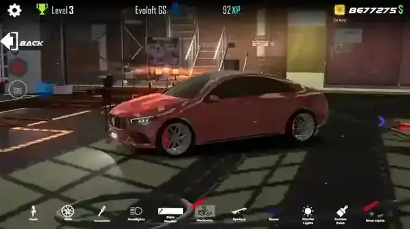 5、在主界面点击左下方的车库按钮可以进入车库,在车库里你可以自由改装自己的车辆和解锁新的汽车。