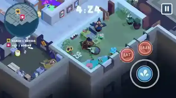 游戏中的机制比较有趣,如果身为狼人的玩家被发现就会吃掉同事。你可以选择小心翼翼躲避其他人类视线来清理垃圾,也可以选择吃掉办公室所有人来清理垃圾,两种方式都可以让你完成任务,选择合适的方法来完成你的目标,不断清理垃圾避免被人类发现。