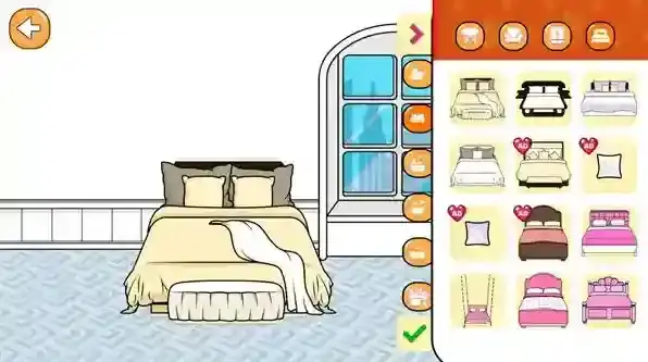 3、进入房间后点击右上角的按钮可以进入装饰界面,在这里你可以自由更换不同的家具物品。