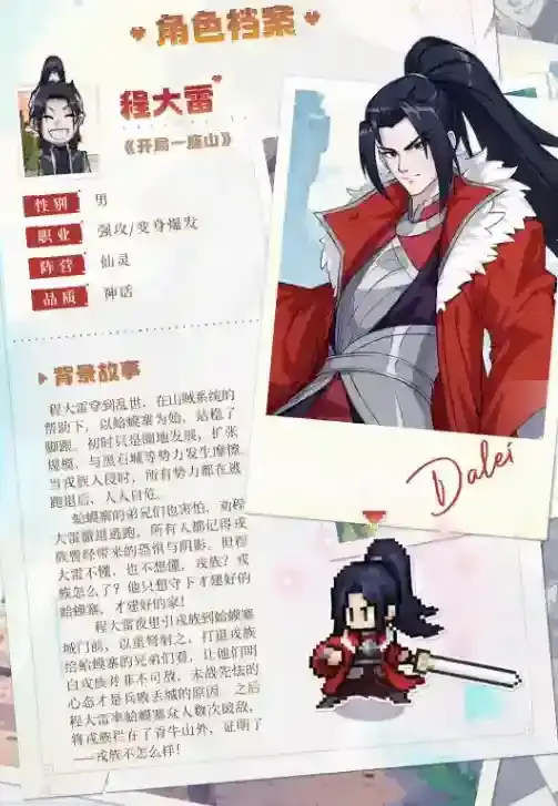 程大雷的技能搭配注定了他是一名优秀的单点爆发战士,无视防御造成一定伤害的机制决定了对前排也能造成不俗的伤害。当本方其他英雄产生控制类效果时可发动追击也决定了有着不错的收割追击机制,当生命低于一定百分比时回复一定生命值也决定了有着不错的坦度,综合来说,抽取到了必练!