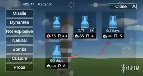 4、打开道具选择界面,挑选适合的爆破类道具,利用其破坏效果来提高建筑的损毁效率,从而积累更多积分。