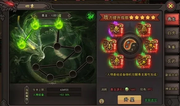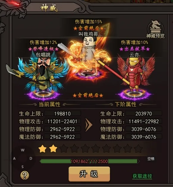 2、通过完成对应的任务获取神威值进行神威提升,获得属性加成。