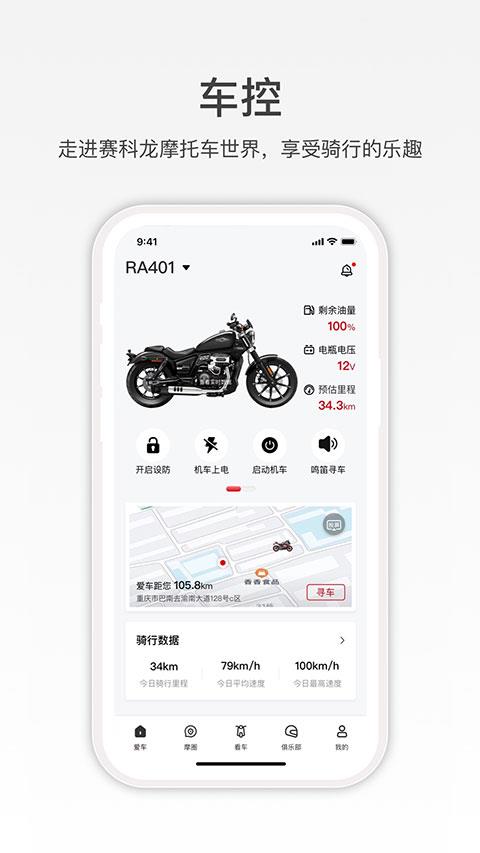 赛科龙app是宗申机车为旗下摩托车爱好者打造的智能化车联网应用,致力于为车主提供全方位、便捷的车主服务。用户通过赛科龙app可实时查看车辆状态,包括电池电量、燃油余量、行驶里程等关键信息,并监控骑行数据,如行驶速度、路程、时长等,获取专业分析报告。其远程操控功能支持鸣笛寻车、实时定位及规划寻车路线,让寻车过程更加高效。同时,赛科龙app的车辆安全监控模块配备智能防盗系统,异常震动或位移时立即推送警报通知,并支持远程锁车。此外,赛科龙app还构建了活跃的摩友社区,用户可分享骑行故事、交流用车心得,并参与俱乐部活动领取官方活动礼品,有需要的用户可以在本站免费下载使用。