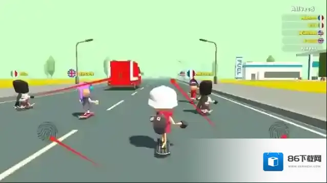 1、进入滑板小子比赛,操控蓝色滑板小子在海滨大道起步,首次躲避迎面而来的观光巴士。