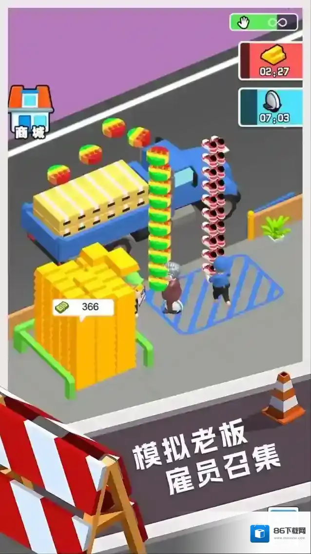 2、进入经营场景,关注卡车旁堆叠的货物,利用倒计时及时处理,点击商城补充资源,维持运营。