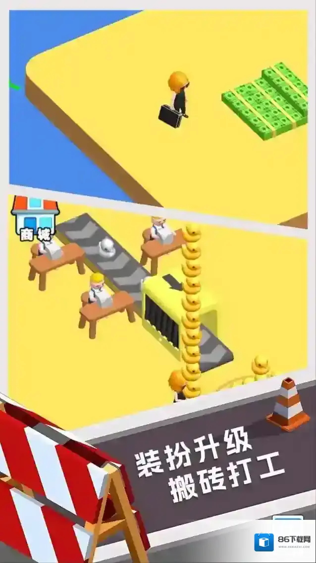 3、管理生产区域,让角色监督流水线,积累财富,点击商城升级设备,提升生产能力,扩大收益。